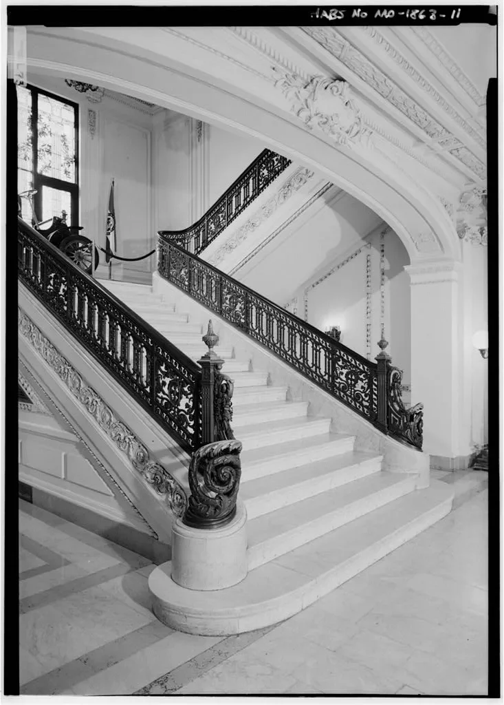 The 35,000-square-foot mansion is a prime example of Beaux-Arts architecture, a style rooted in classical symmetry and ornamentation. It was built of Bedford limestone with a Carthage stone base and topped by a red tile roof. The front entrance features a grand portico with six 25-foot Corinthian columns. Decorative ironwork, imported chandeliers, and stained-glass windows add to the home’s craftsmanship and detail. A bronze porte-cochère crafted in New York allowed for covered carriage arrivals.