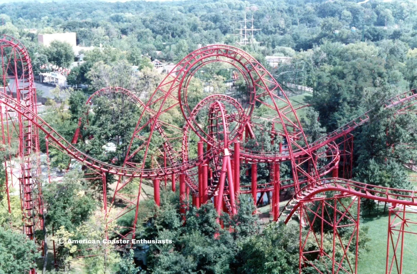 It featured multiple inversions, including interlocking loops and the debut of the “Kamikaze Curve,” a pioneering element later known as a batwing, making it one of the most technologically innovative rides of the era.