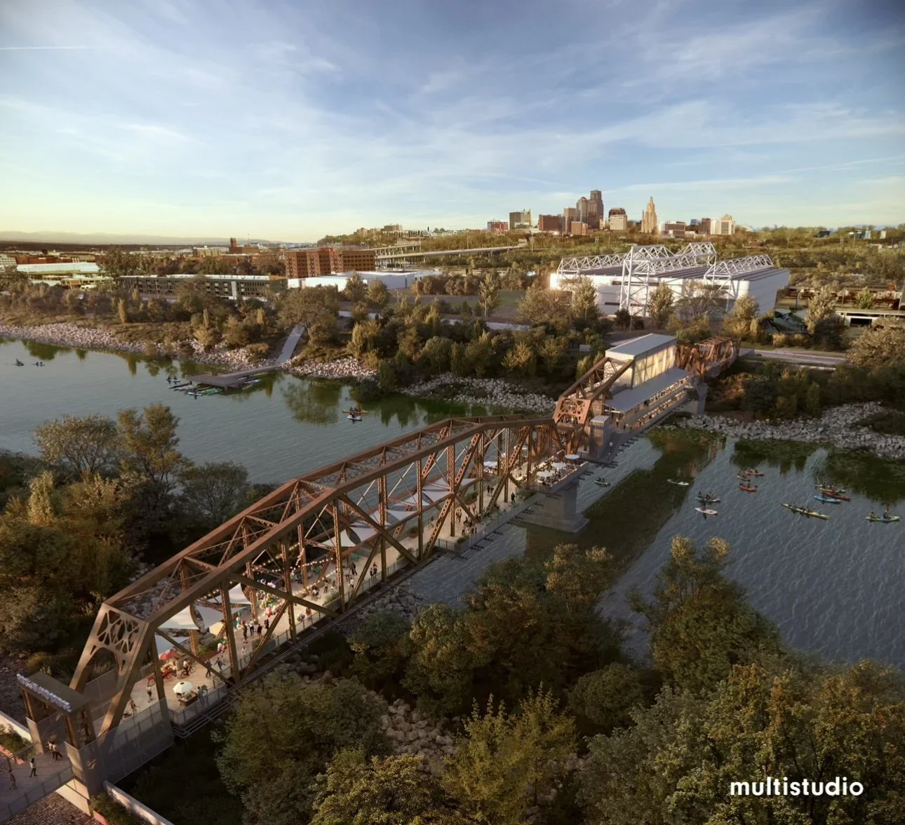 The project involves raising the structure to meet modern levee standards—utilizing the original 1950s screw jacks—and adding 11,000 square feet of concrete decking. Once complete, the bridge will serve as a vibrant community "steel park," featuring kitchens, bars, and event spaces while connecting regional levee trails, finally reclaiming the riverfront for public use.